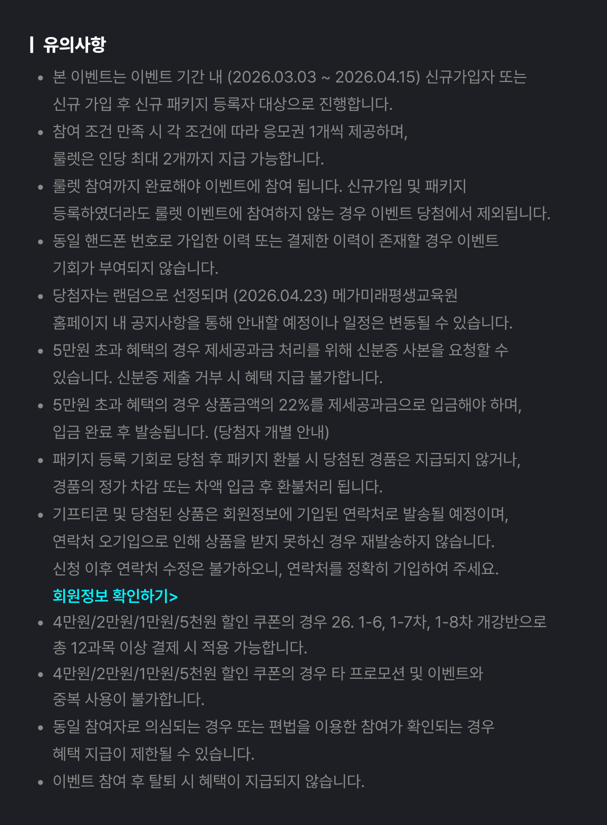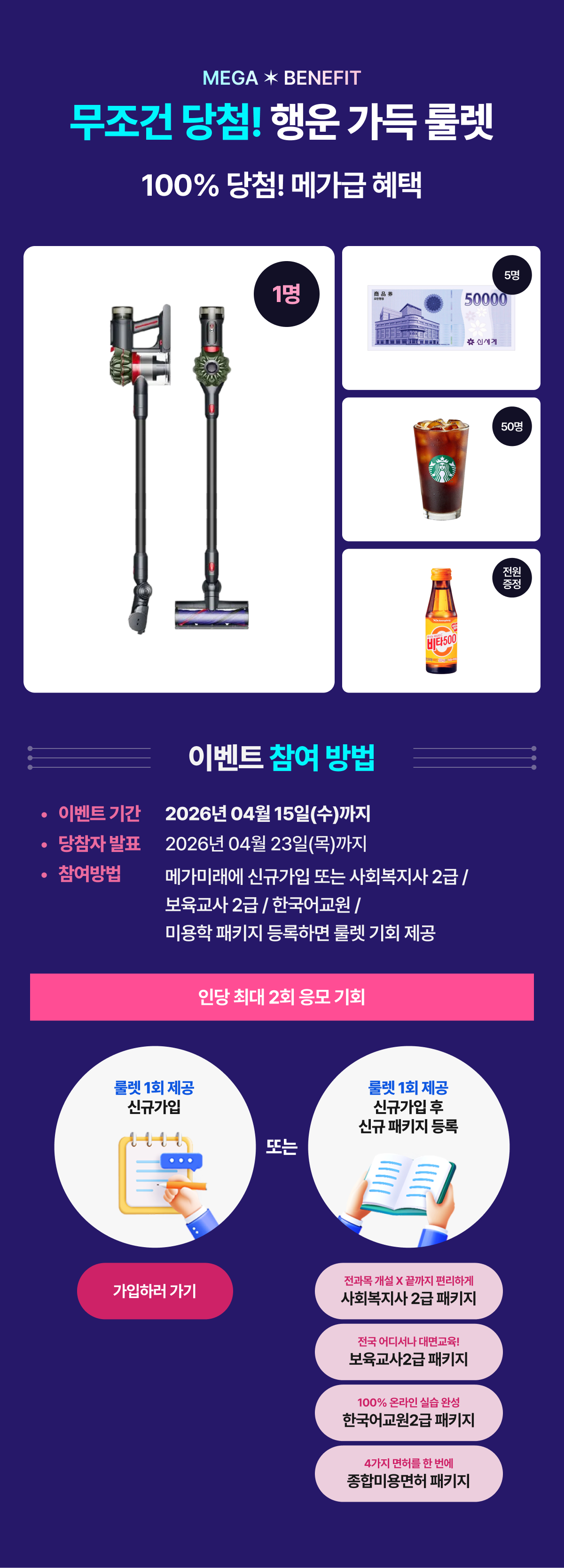 - - 당첨자는 랜덤으로 선정되며 (2026.04.23) 메가미래평생교육원 홈페이지 내 공지사항을 통해 안내할 예정이나 일정은 변동될 수 있습니다.